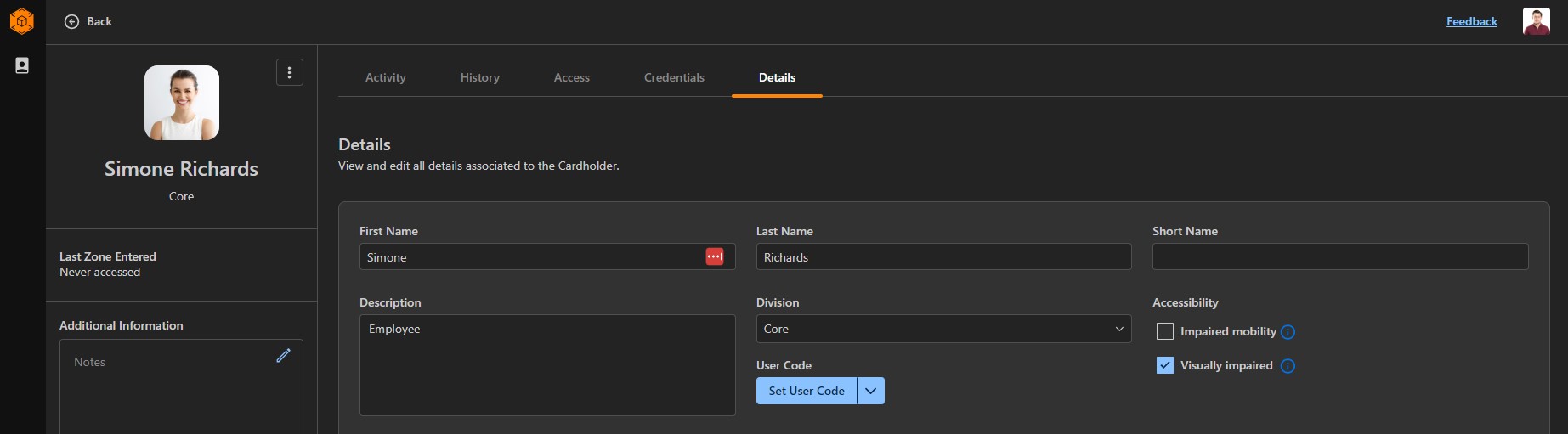 1. Navigate to the Details Tab: Open the cardholder's profile and navigate to the Details tab.